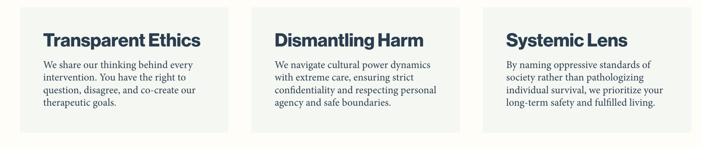 We actively address the systems of oppression that shape our mental health. Therapy should not teach you to better tolerate injustice; it should support you to navigate your reality with dignity. In the context of Pakistan especially, we are transparent about our ethics to prevent common harms such as shaming, gaslighting, or value imposition.