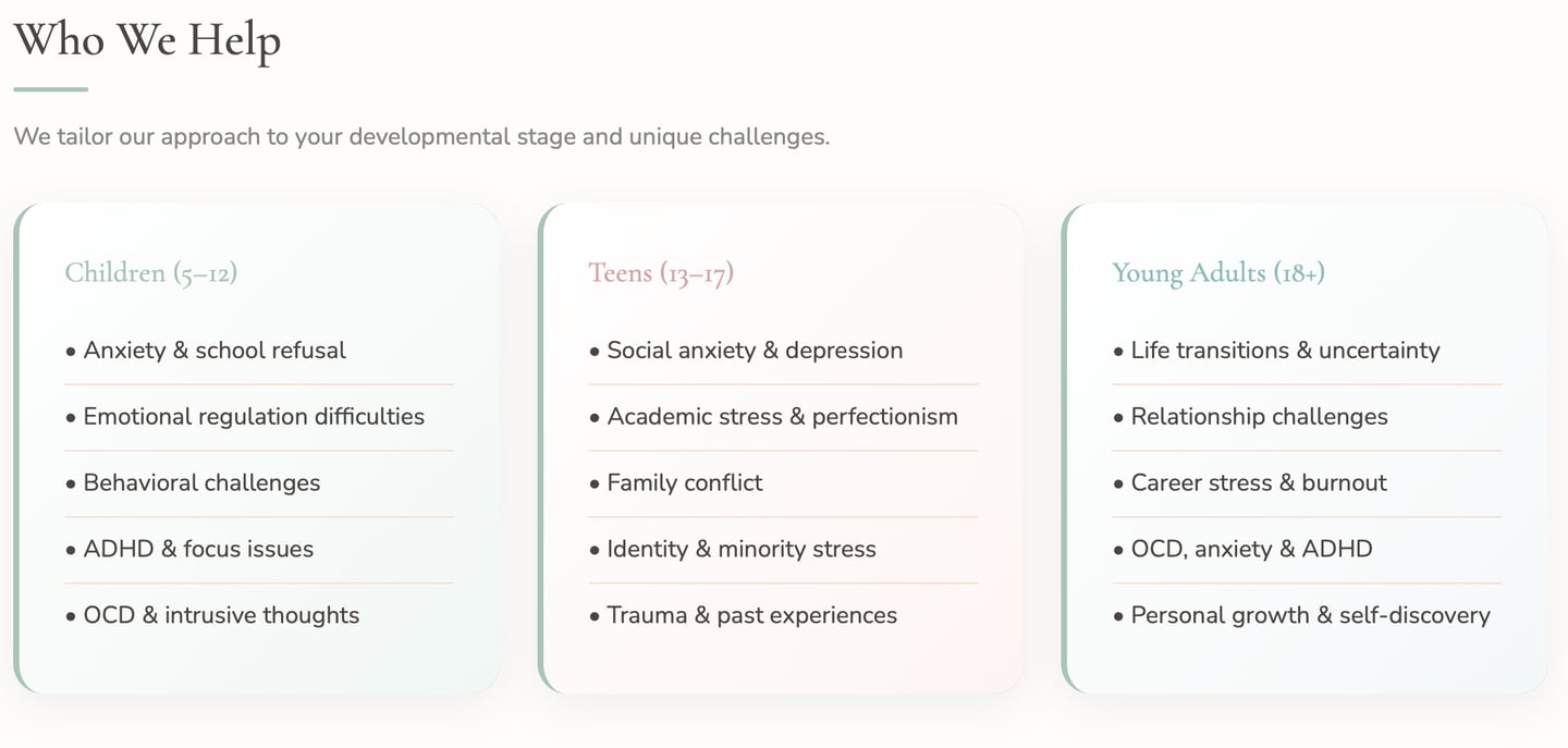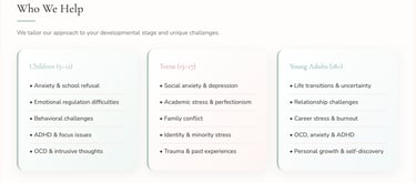 Personalized, evidence-based care that meets you exactly where you are—whether you're a child struggling with anxiety, a teen navigating identity, or a young adult facing life transitions.